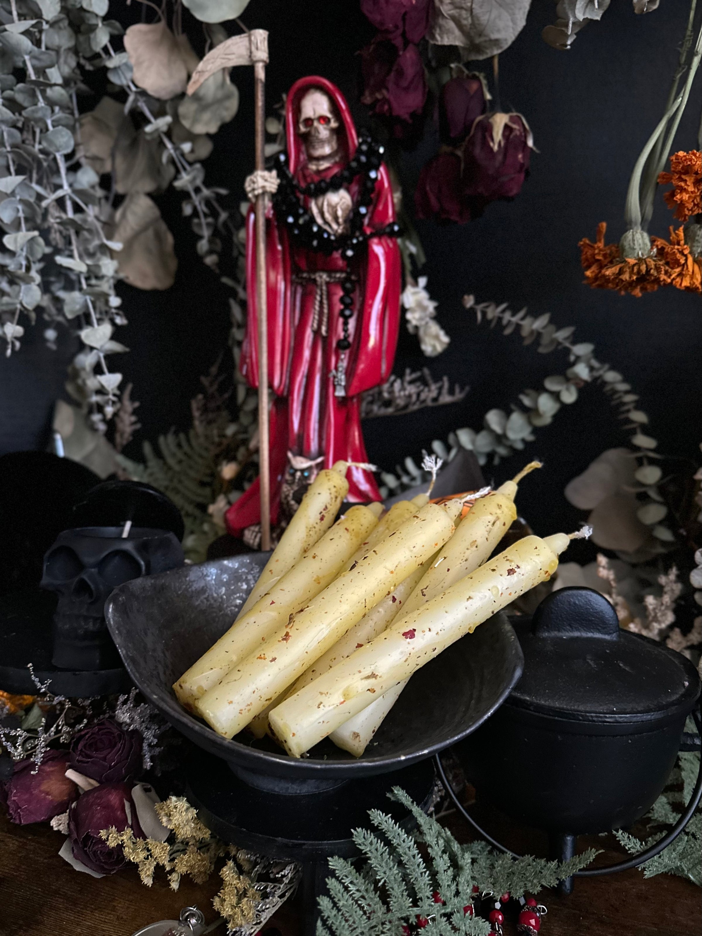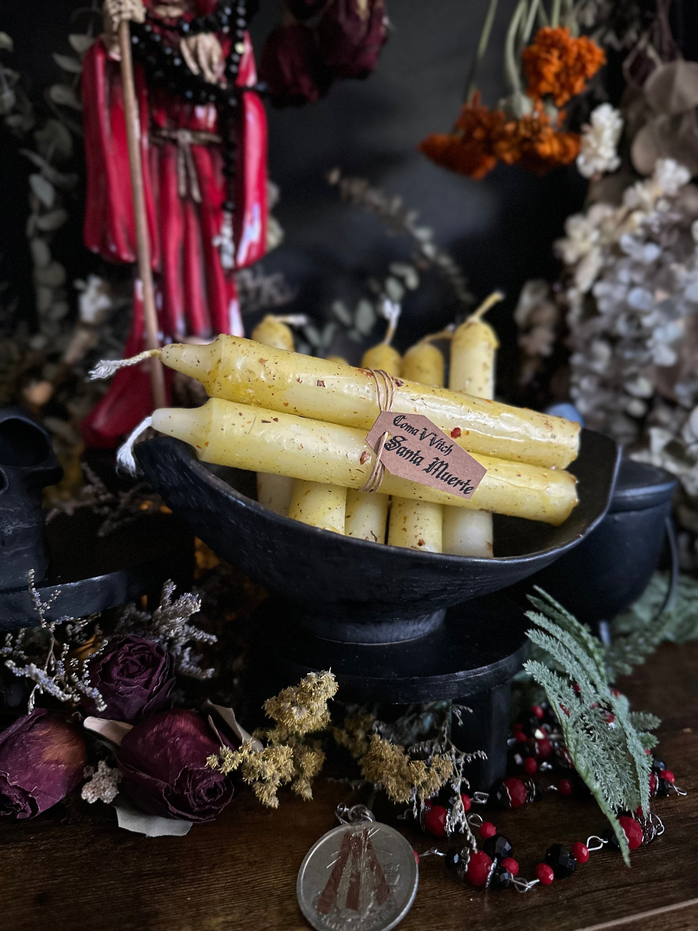These candles are crafted as humble offerings to La Santísima. Each candle has taken on a natural yellow tone from the marigold and sunflower within, then is dressed with herbs and oils sacred to Her. They are designed for general devotional use, to honor Her presence, accompany prayer, or serve as a simple offering at Her altar. Burn when approaching Her for guidance, protection, clarity, or gratitude.