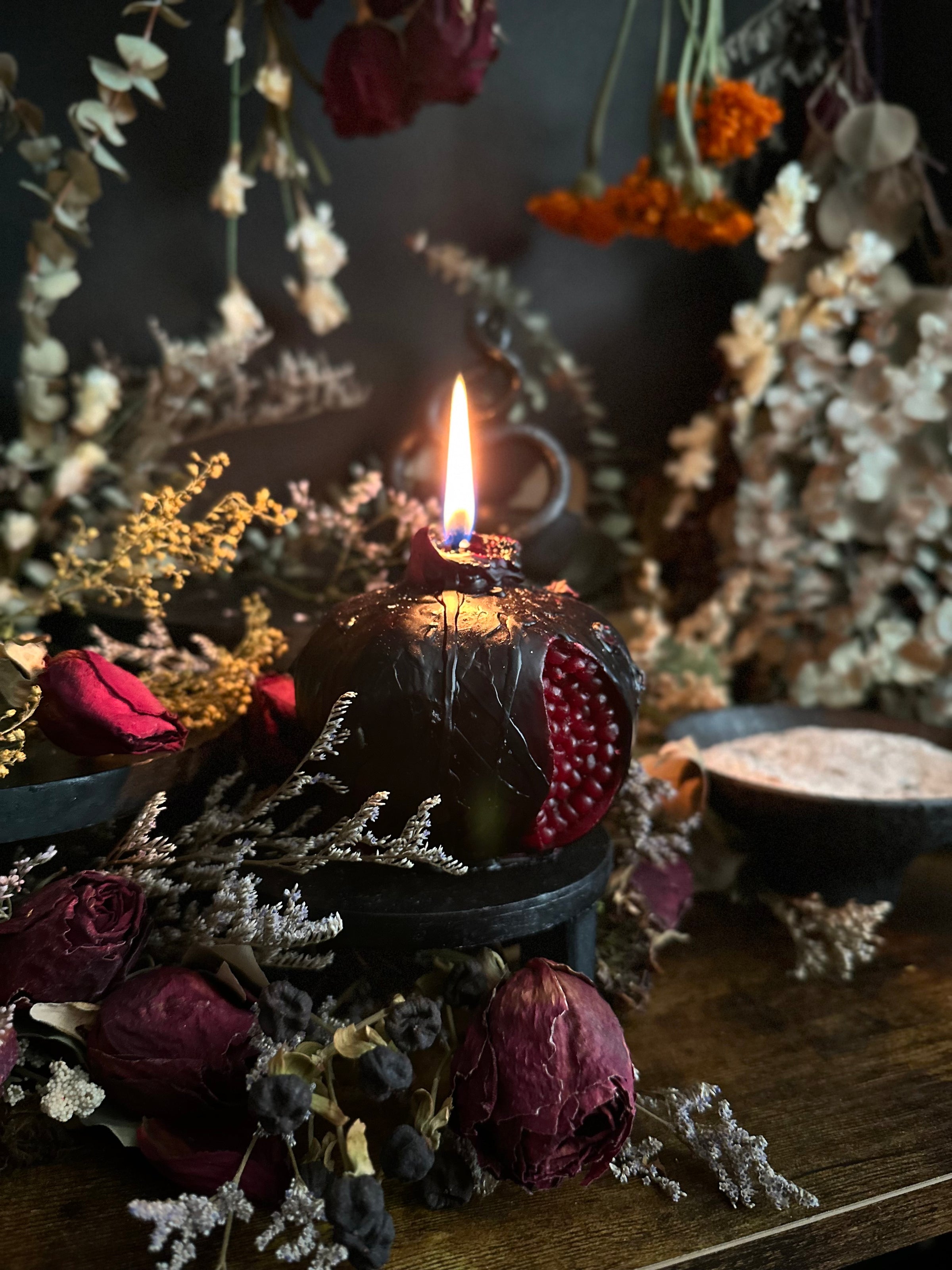 Hand-molded and individually wax-painted, each Hekate Pomegranate Candle is crafted as both offering and instrument of devotion to the Titaness of Crossroads, Sorcery, and the Night.