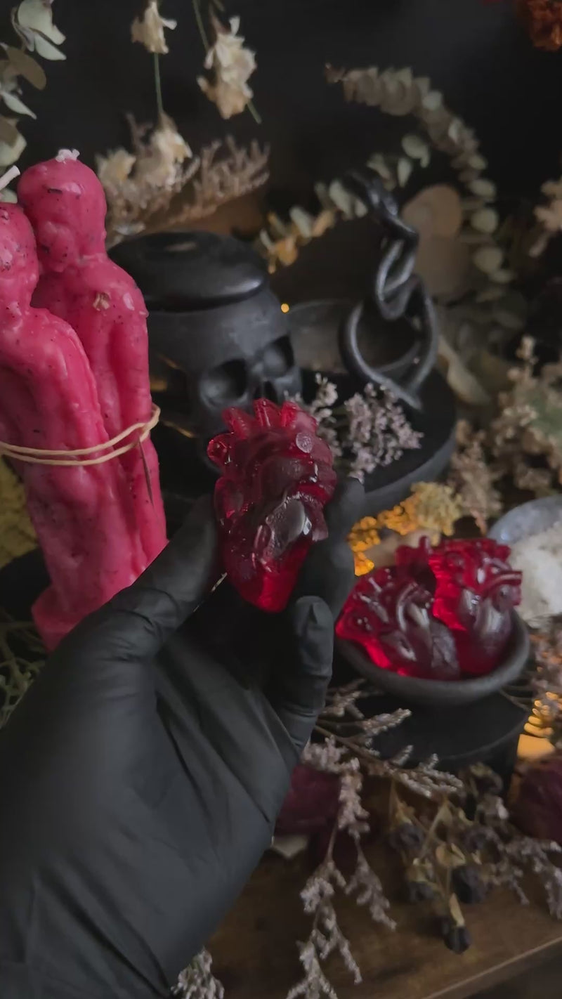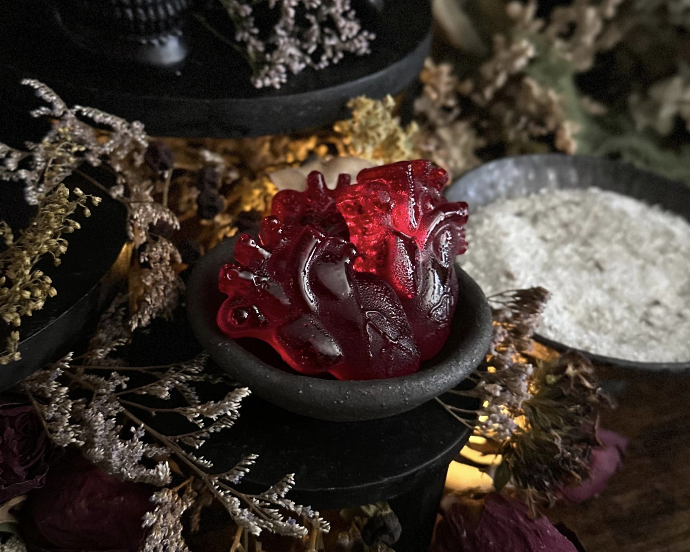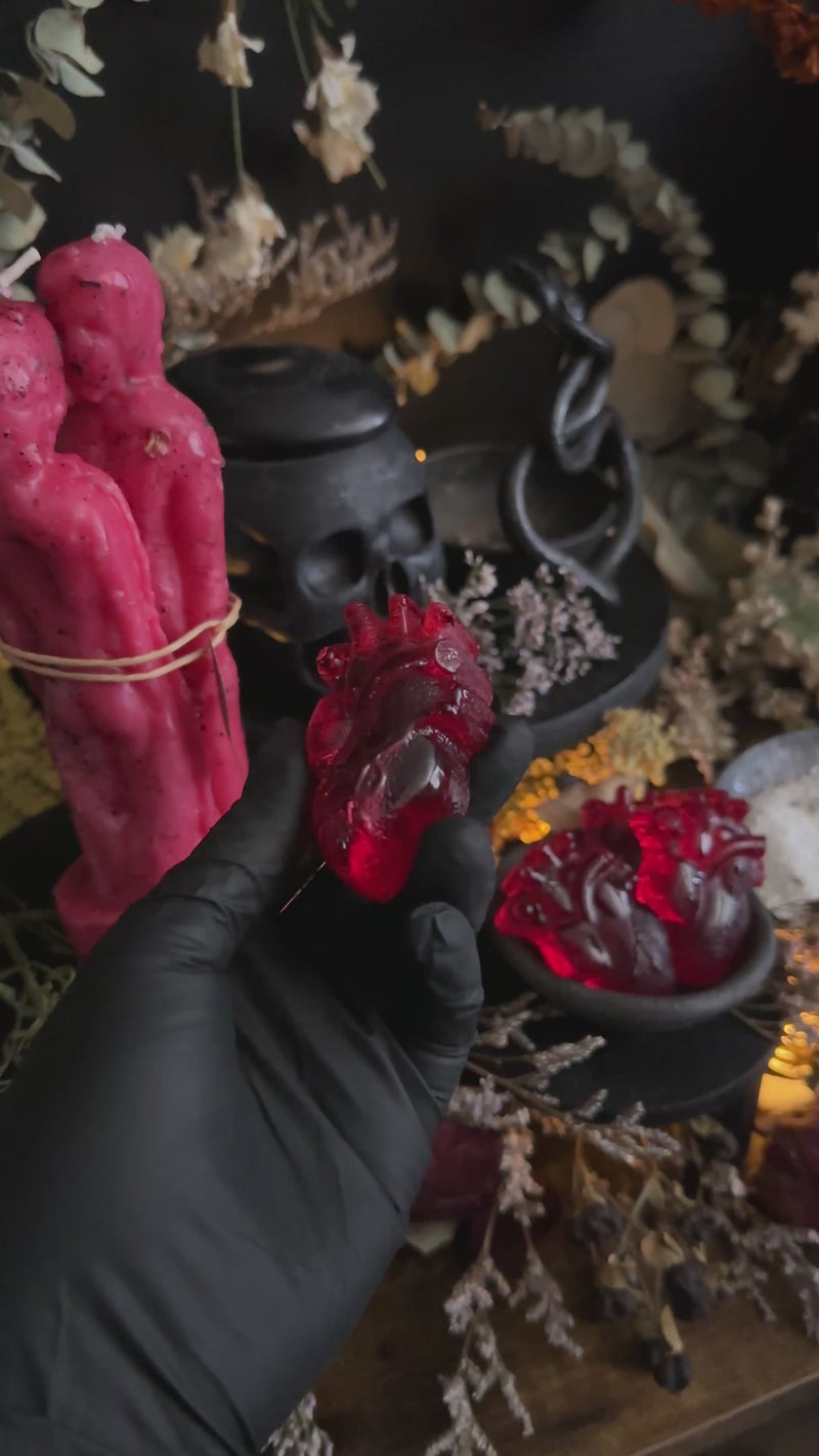 Hand poured from deep crimson gel wax, The Kept Heart is a life like vegan alternative to animal or human hearts, designed for serious practitioners of emotional, love, and baneful magick. Its supple, jelly like texture evokes the pulse of the living heart. A vessel of desire, obsession, and will.