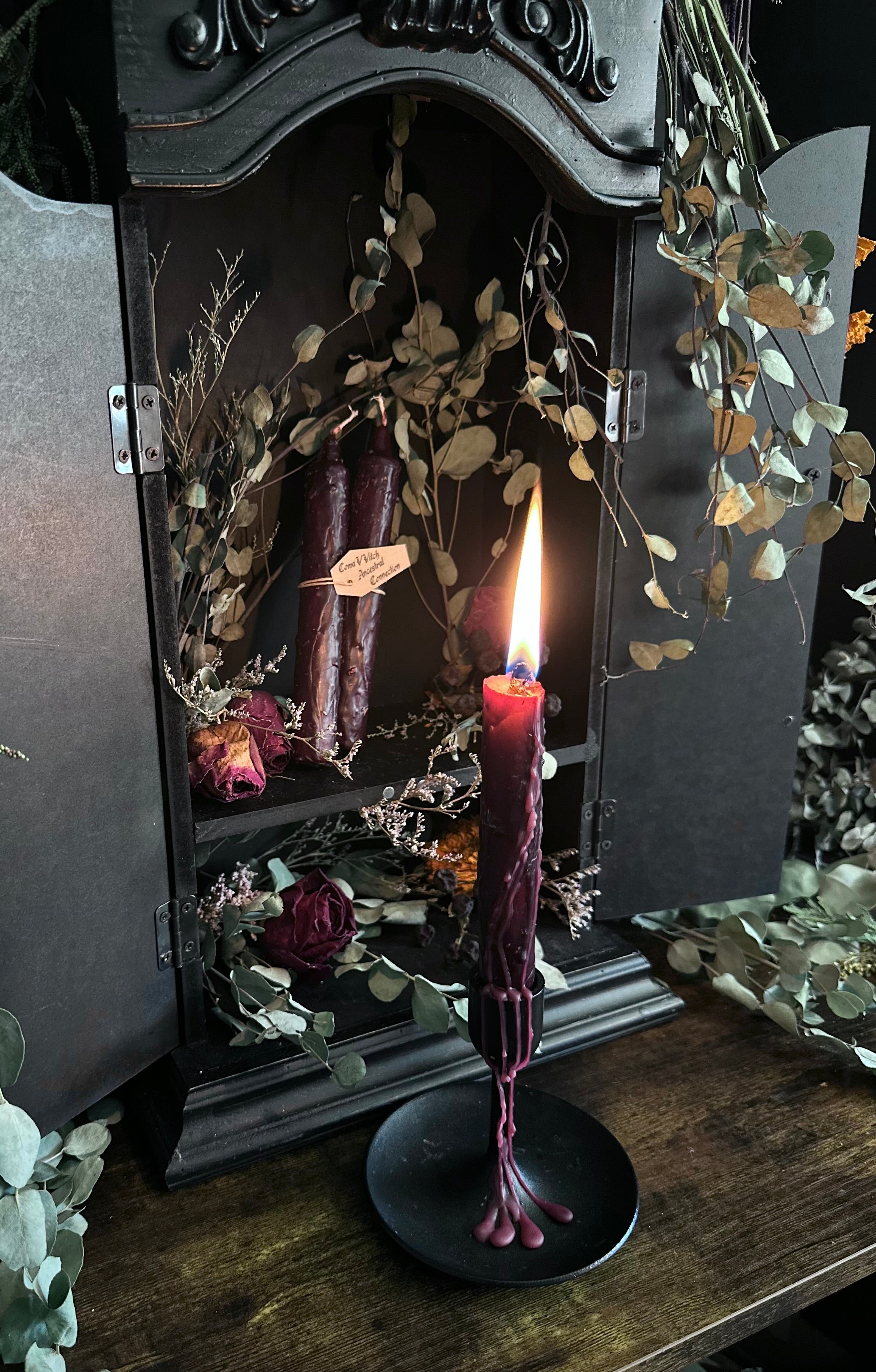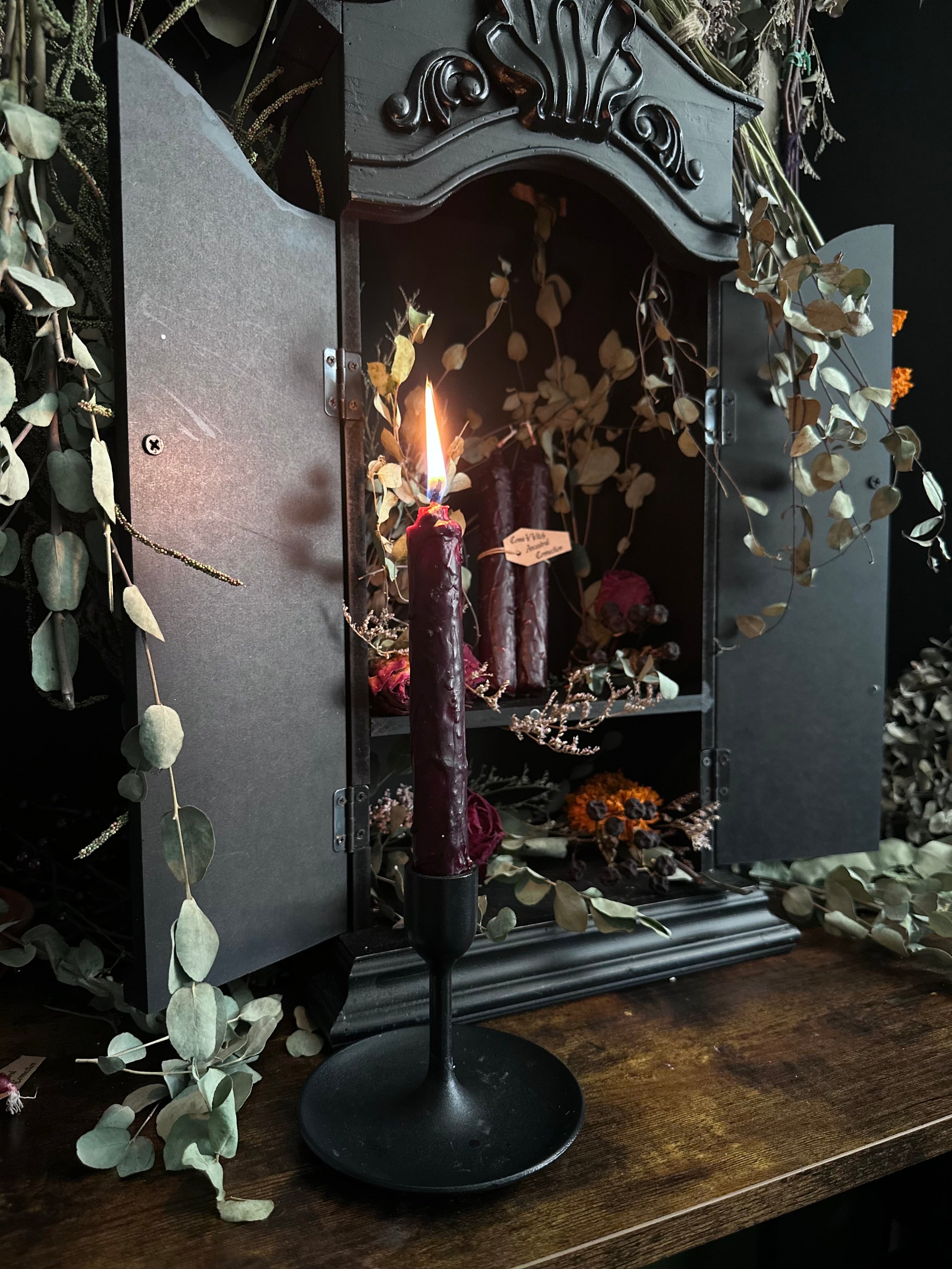 Warning:⚠️ For ritual use only. Not for consumption. Burn in a fire-safe holder in a well-ventilated areaand never leave unattended. Keep away from children, pets, drafts, and flammable materials. Herbs may spark, smoke, or crackle while burning; trim wick before lighting and monitor flame closely. Discontinue use if irritation from smoke occurs.
