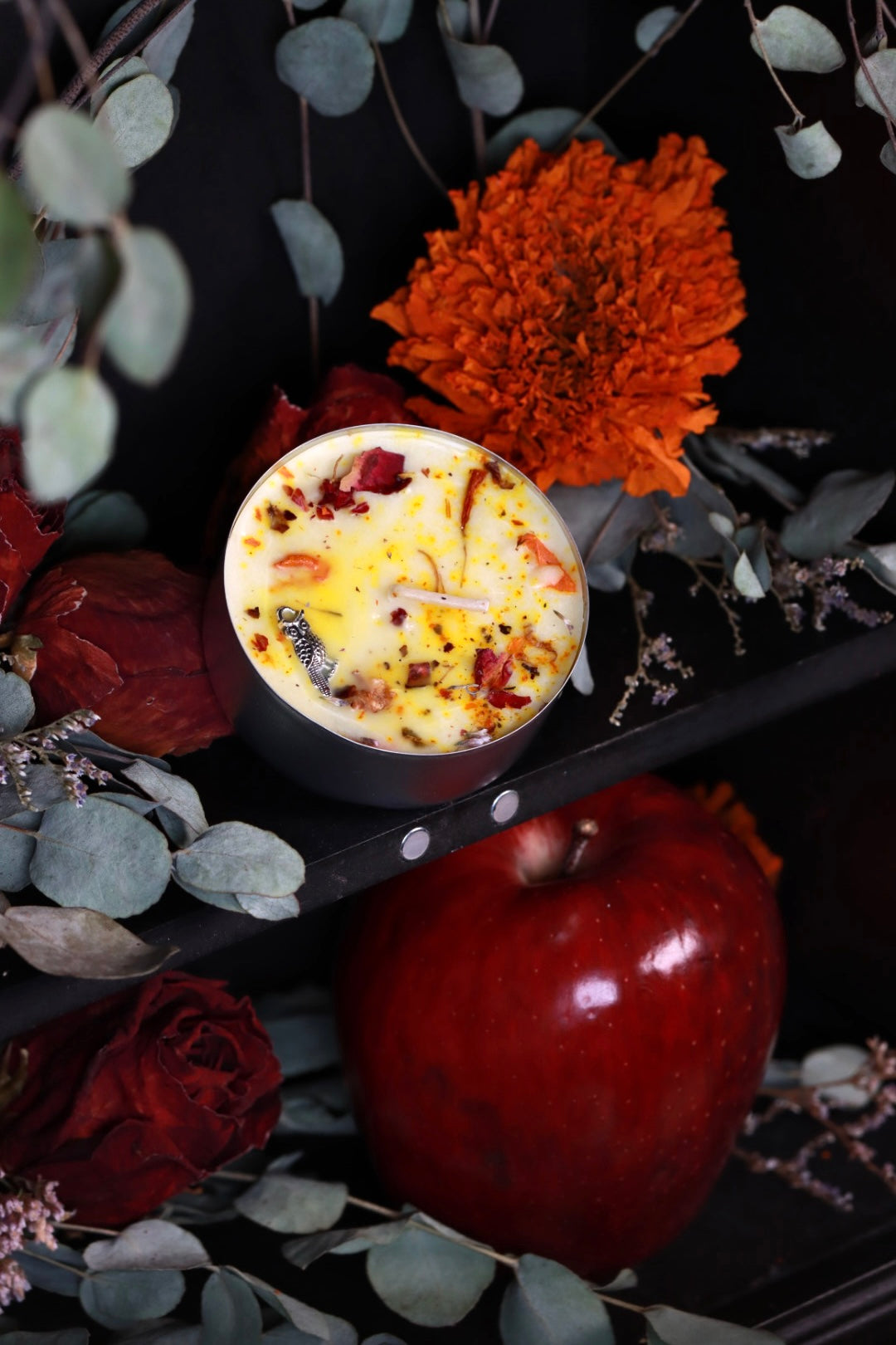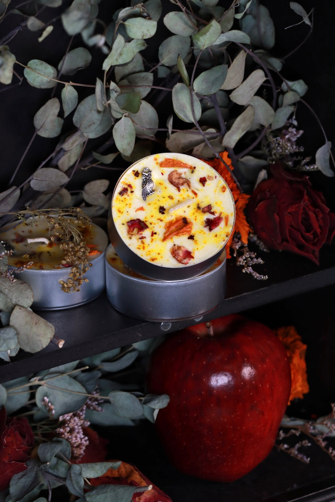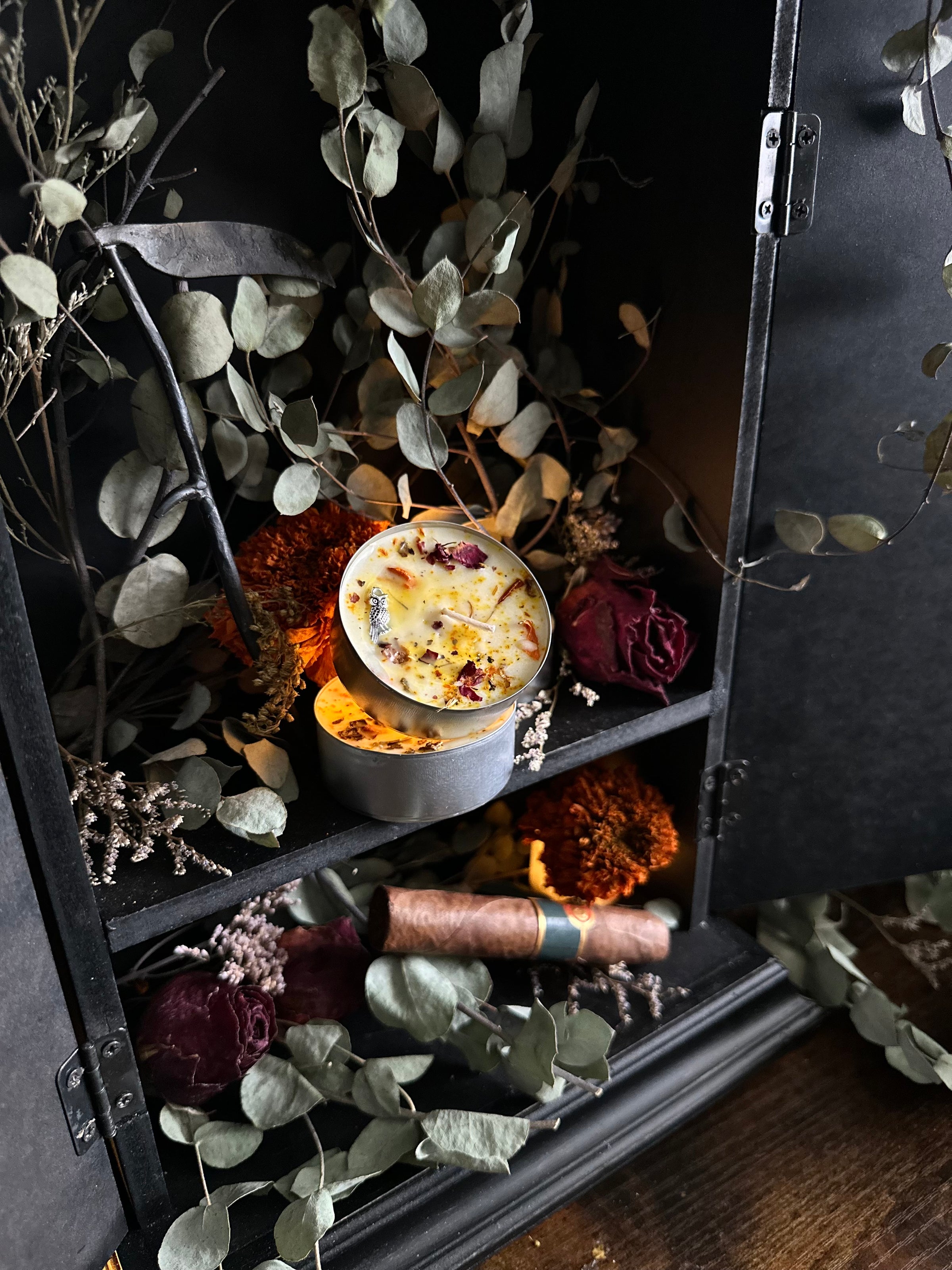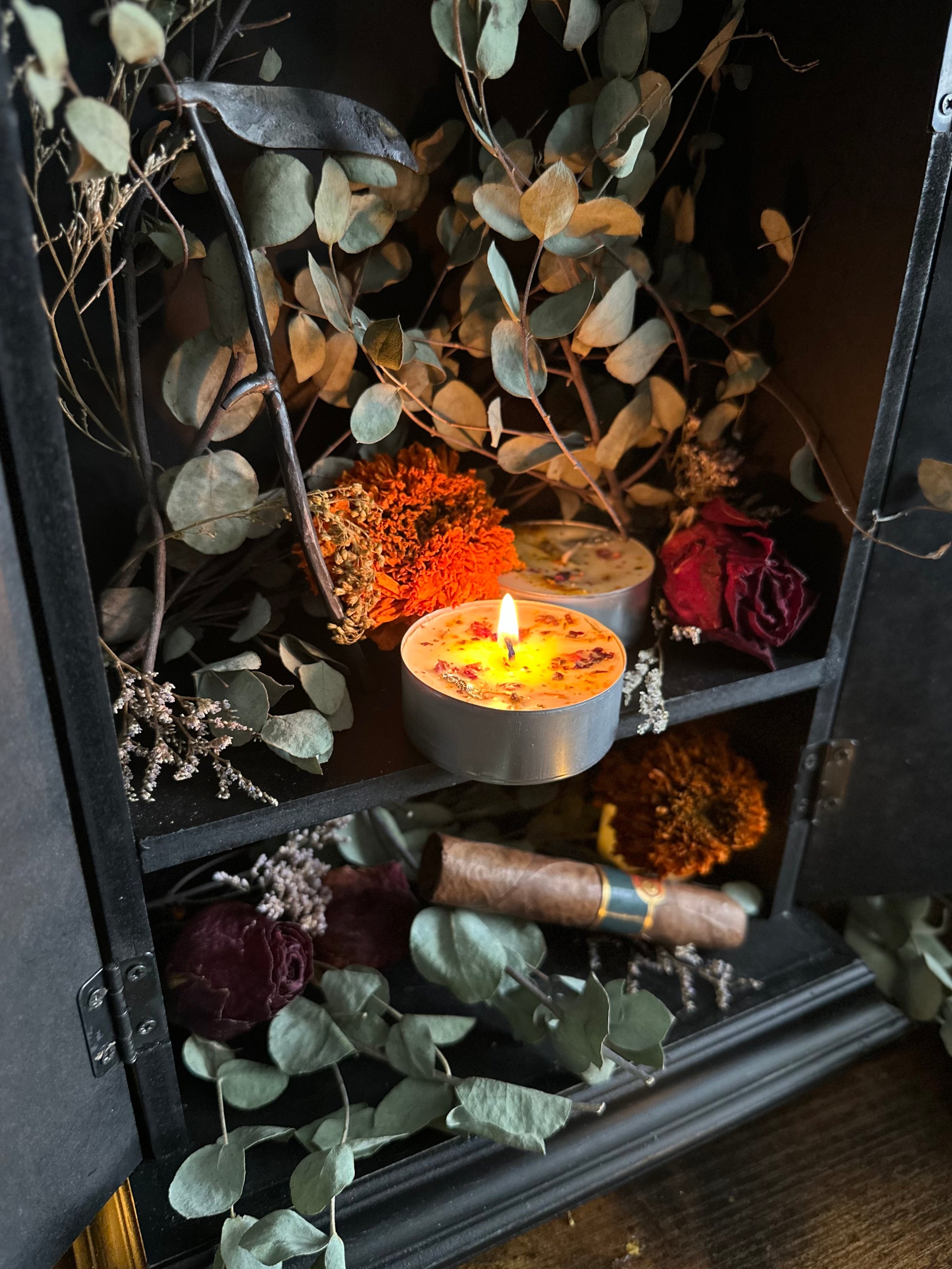 A large devotional tealight created as a simple offering for Santa Muerte.